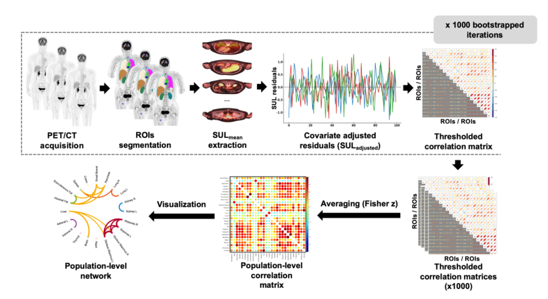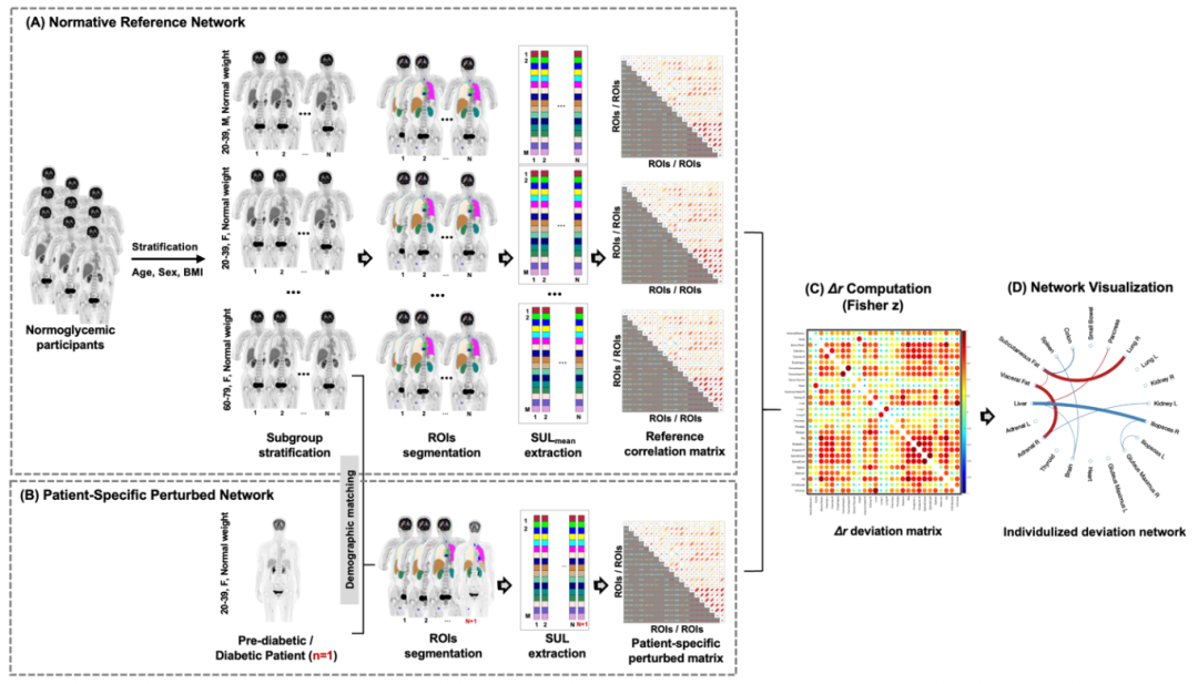 本研究采用全身[1?F]FDG PET/CT成像技術,一次掃描即可同步捕捉全身主要器官的全景葡萄糖代謝,結合機器學習與可解釋性分析,為探索糖尿病跨器官代謝失衡提供了全新視角。研究團隊在實驗室前期工作的基礎上?(Sun?et?al,?EJNMMI,?2022;?49(8):?2994-3004),基于多中心1149例受試者的全身PET/CT數據,利用廣義線性模型校正年齡、性別、BMI等混雜因素,提取20個關鍵器官的代謝特征。通過計算器官間的代謝相關性,團隊分別繪制了正常血糖、糖尿病前期和糖尿病三大群體的全身代謝網絡圖譜,并采用“個體化偏差網絡”概念,用于刻畫每位受試者相對于健康常模的代謝協同異常程度。