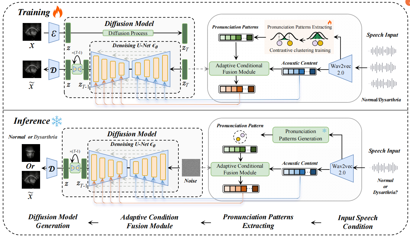 近日,中國科學(xué)院深圳先進(jìn)技術(shù)研究院環(huán)繞智能與多模態(tài)研究室提出從語音到舌超聲生成的統(tǒng)一擴(kuò)散模型框架,能夠根據(jù)輸入的未知語音信號(例如健康或病理性語音),自適應(yīng)地生成高保真度的舌體超聲數(shù)據(jù),這項(xiàng)研究為解決言語障礙評估與康復(fù)中的相關(guān)技術(shù)難題提供了新路徑,相關(guān)研究已正式發(fā)表于國際期刊Information Fusion。