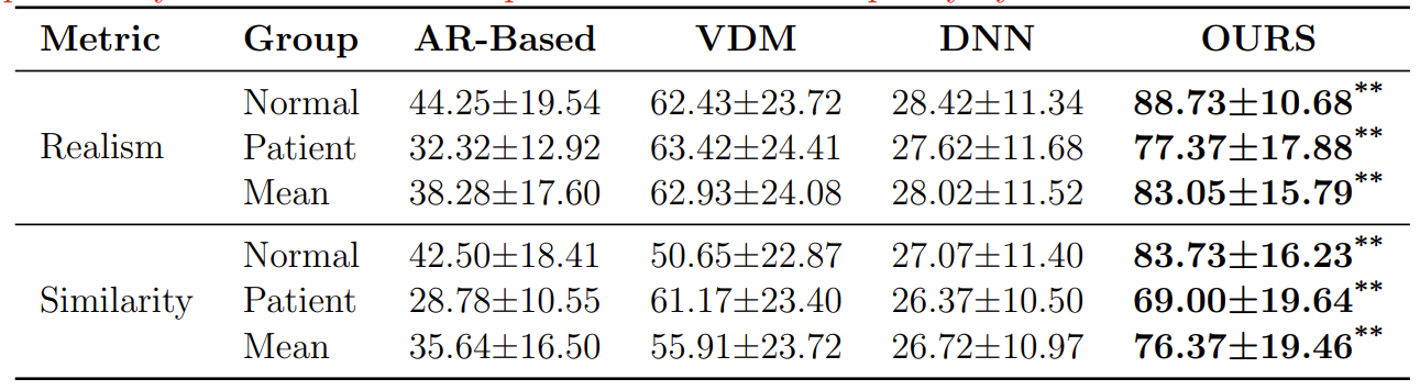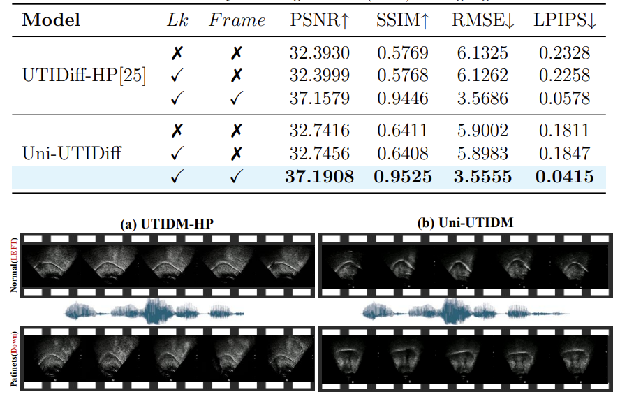 實(shí)驗(yàn)結(jié)果表明,Uni-UTIDiff 不僅在統(tǒng)一框架下能夠分別達(dá)到針對健康與病理語音的專家模型性能水平,還能在生成的舌超聲圖像中展現(xiàn)出優(yōu)異的清晰度與自然度,充分驗(yàn)證了其在跨發(fā)音模式下的魯棒生成能力。