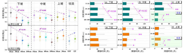 中國科學院亞熱帶農業生態研究所陳洪松研究員團隊在廣西環江通過水穩定同位素示蹤技術,揭示了坡地土壤厚度對入滲和徑流水補給特征的影響機制。該研究選取兩處土壤厚度差異顯著的山坡,通過長期原位監測獲取土壤水和徑流樣本,并測定其氫氧穩定同位素組成。基于分段同位素平衡模型,量化了降雨對可移動水的補給比例、平均滯留時間及干旱期徑流的蒸發損失比例。結果表明,滲透性更高的淺土山坡具有快速的水分補給特征,表現為更高的雨水補給和水分蒸發損失比例及更短的水分滯留時間(圖1)。厚土山坡補給比例和滯留時間具有極顯著的相關性(R2=0.78),而淺土山坡這種快速且復雜的水文特征導致其通過水文參數預測過程的難度更高(圖2)。因此,即便是在小流域范圍,在水資源優化配置方面也需要考慮進行差異性的管理,而土壤厚度理論上是一個重要的參考指標。