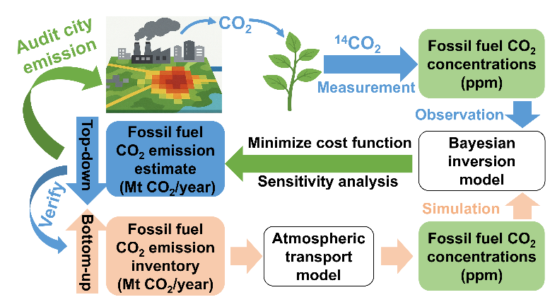 ????近日,中國科學院廣州地球化學研究所研究員張干團隊在利用植物放射性碳(14C)約束與貝葉斯反演進行城市尺度化石源二氧化碳排放(CO2ff)核查方面取得新進展。團隊將基于植物?14C估算的?CO2ff?與大氣傳輸—反演框架深度耦合,構建出一套低成本、可擴展且面向治理的碳排放獨立核查方法。相關成果于10月22日發(fā)表于國際期刊?《Environmental Science & Technology》。?