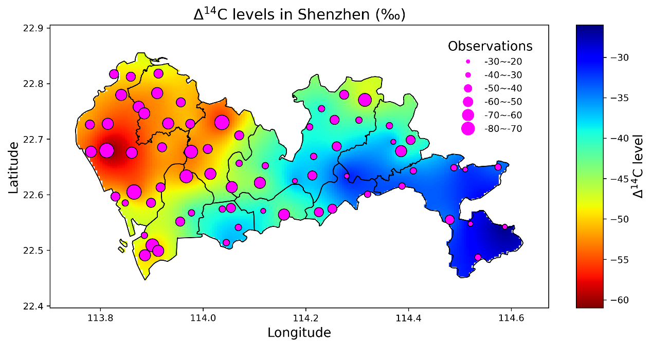 圖2:深圳市植物?Δ1?C 的空間分布。洋紅色圓點表示實測的?Δ1?C 值,背景克里金插值估計。