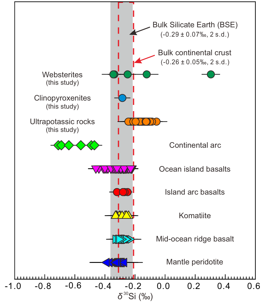 ?硅是地球中豐度第三的元素,其在地球不同地質儲庫中的分布與循環過程對理解地球內部物質分異和地表環境演化具有重要意義。硅有三種穩定同位素(28Si, 29Si, 和30Si),常被應用于示蹤硅的地球化學循環過程。然而,要準確利用硅同位素作為“示蹤劑”,必須明確其在各類地質儲庫中的組成特征。傳統觀點認為,地幔高溫部分熔融形成新生地殼的過程不會引起顯著的硅同位素分餾,且由于大陸地殼與全硅酸鹽地球(Bulk Silicate Earth, BSE)的硅同位素組成幾乎一致(見圖1),因此,地幔被認為與BSE具有相似的硅同位素組成,不應出現明顯異常。然而,近年來發現一些洋島玄武巖(OIB)和大陸弧巖漿具有顯著偏輕的硅同位素組成(低于BSE),這暗示地幔中應存在一個與之互補的重硅同位素儲庫以維持全球硅同位素的質量平衡。但此前報道的各類地幔巖石(包括橄欖巖、輝石巖及其熔融產物)的硅同位素數據大多等于或輕于BSE,重硅地幔儲庫始終未被明確識別。